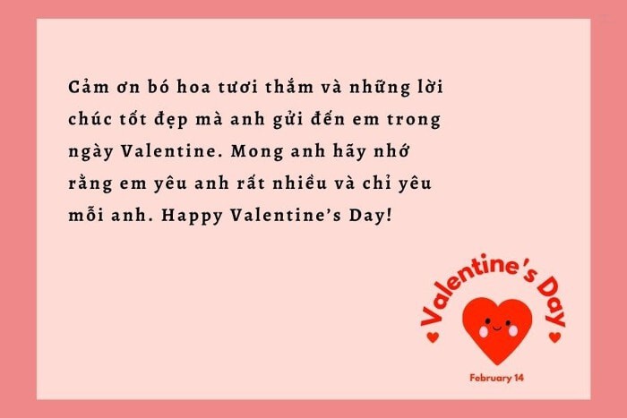 • “Cảm ơn anh vì đã cùng em xây dựng một tình yêu đẹp. Chúc mừng ngày Valentine của chúng ta!”