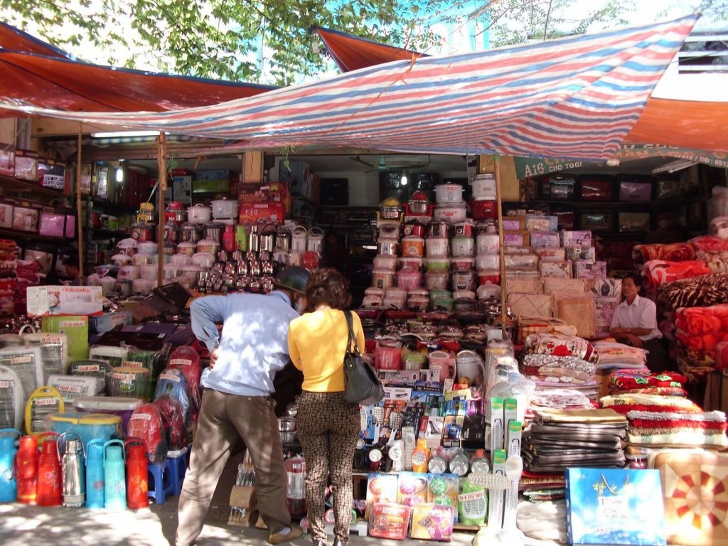 Các chợ như Bình Tây, Tân Bình (TP.HCM) hay Đồng Xuân (Hà Nội) là điểm đến quen thuộc của dân buôn sỉ lâu năm. Tại đây có nhiều sạp chuyên bán đồ gia dụng giá rẻ, có thể thương lượng trực tiếp để có giá tốt nếu mua số lượng lớn. Ưu điểm của nhập hàng từ chợ là hàng hóa có sẵn, dễ xem mẫu và nhập hàng nhanh.